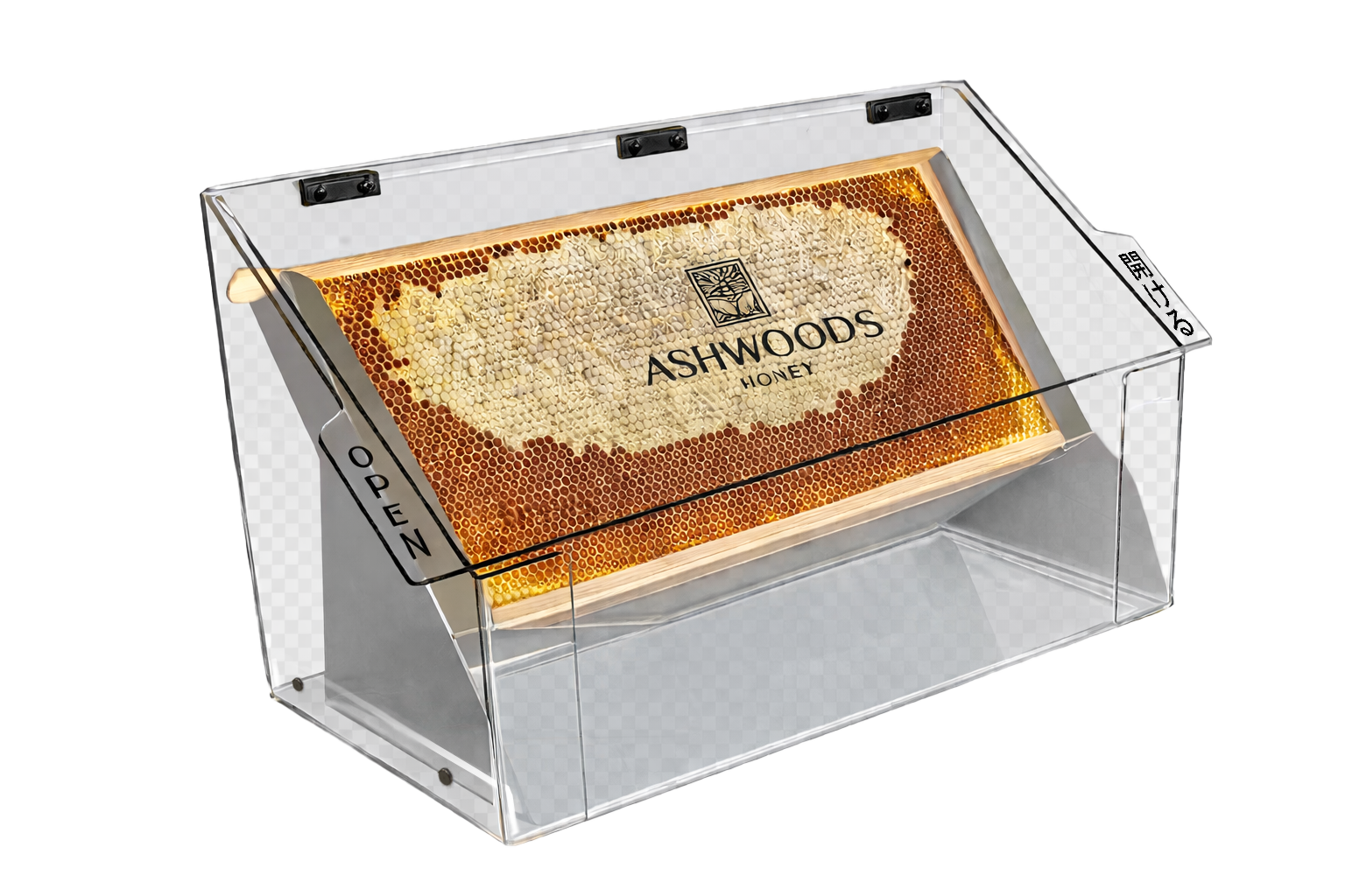 またカバー正面下部をあえて開けた構造しているため、垂れてきた蜂蜜のみをお召し上がりになりたいお客様にも使いやすい設計となっています。